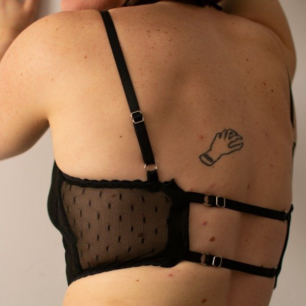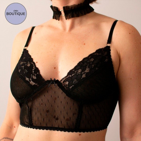 Top o corpiño con gran bajo busto. Tiene vaina(forro del aro) NO tiene aro metálico. De microtul y puntilla, tiene breteles regulables en la espalda.